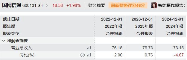 根据国网信通披露的年报数据,2022年~2024年公司营业收入整体波动不大,分别为76.15亿元、76.73亿元和73.15亿元,同比增幅分别为2%、0.76%和-4.67%。