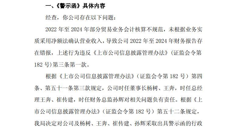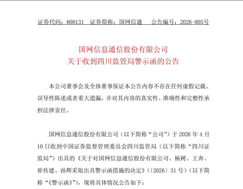 国网信通(SH600131,股价18.58元,市值222.7亿元)4月10日晚间公告称,公司于今日收到四川证监局出具的《警示函》。经查,公司2022年至2024年部分贸易业务会计核算不规范,未根据业务实质采用净额法确认营收,导致财报存在错报,违反相关规定。四川证监局决定对公司及时任董事长杨树、王奔,时任总经理王奔、崔传建,时任财务总监孙辉采取出具警示函的行政监管措施,并计入证券期货市场诚信档案。
